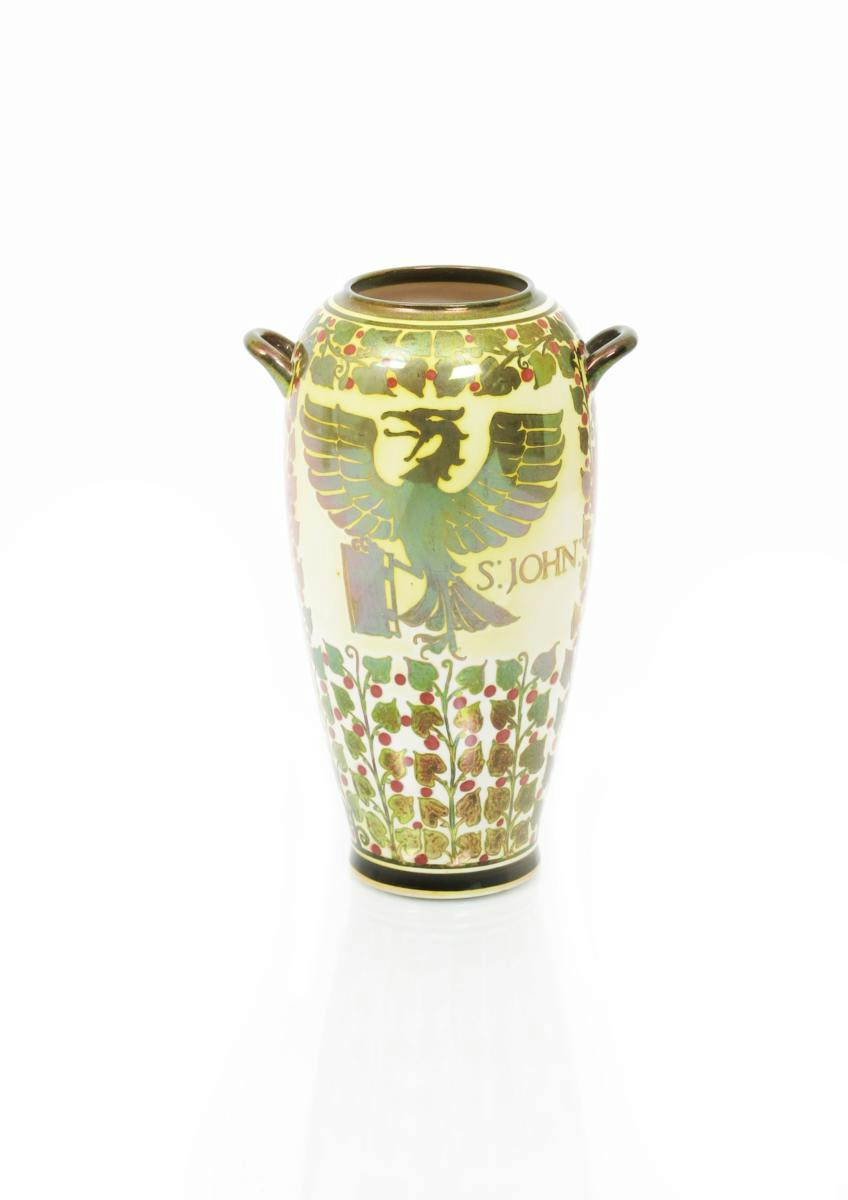 A Pilkington's Lancastrian vase by Gordon Forsyth, dated 1907, shouldered twin-handled form, painted with the Lion of St Mark, the reverse with the Eagle of St John, in gold and ruby lustre on a cream ground impressed mark and date mark, painted artist cipher, small chip to base rim 21cm. high