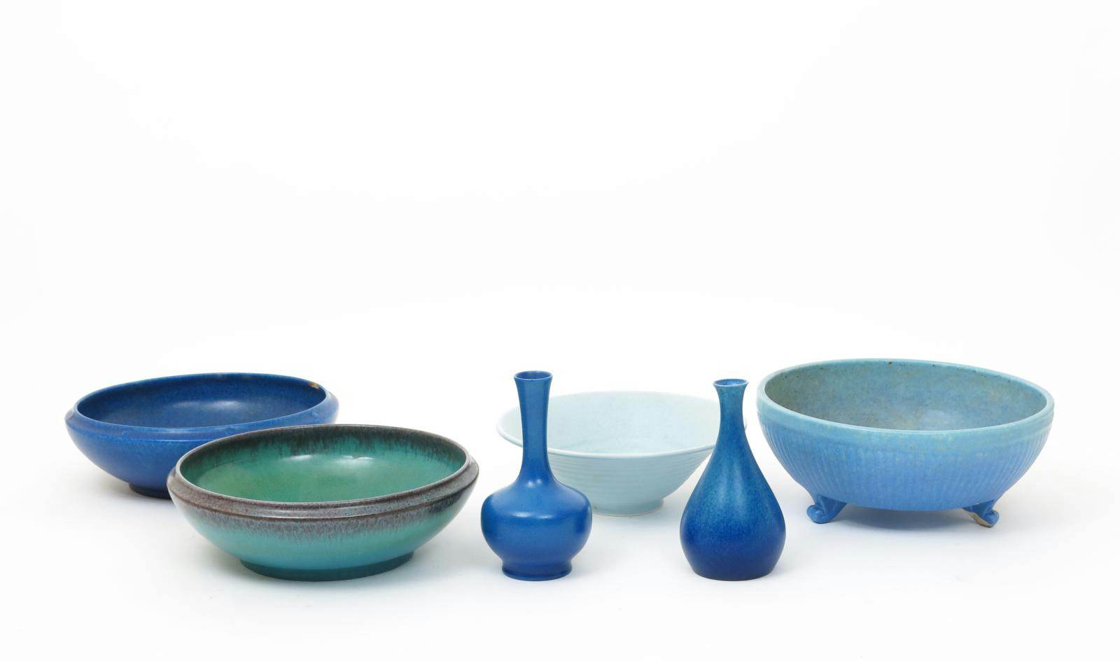 A Pilkington's Lancastrian solifleur vase, dated 1913, covered in a matt blue glaze, another vase and four bowls impressed marks, damages 18cm. high (6)
