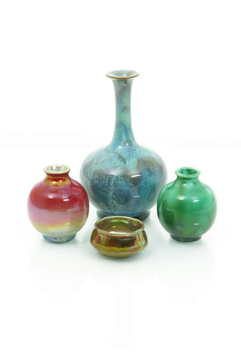 A Pilkington's Lancastrian miniature bowl, fluted form, covered in a golden glaze, two miniature vases and a solifleur vase covered in a curdled glaze impressed marks, chip to one vase bowl 5cm. wide (4)