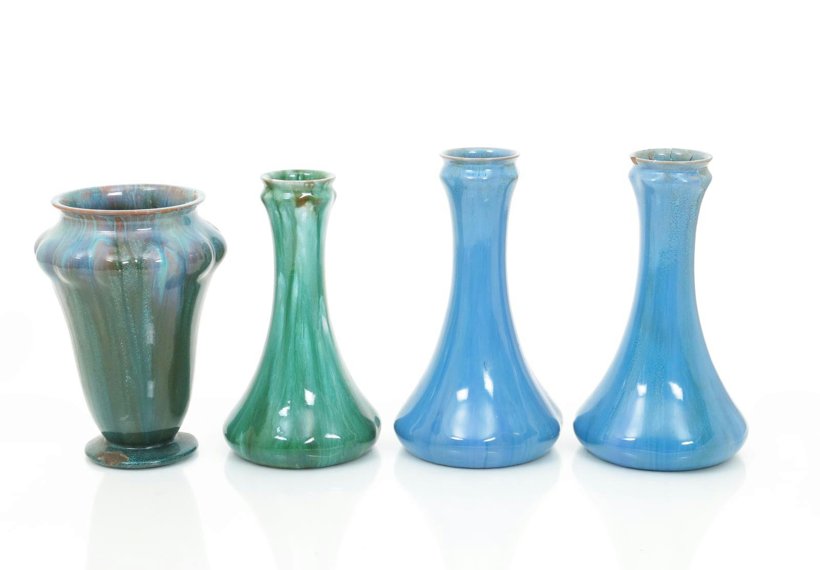 A pair of Pilkington's Royal Lancastrian vases, shape no.2786, tapering cylindrical form, covered in a streaked and curdled blue glaze, another covered in a green glaze and another Pilkington's vase impressed marks, damages and repaired chips, 27.5cm. high (4)