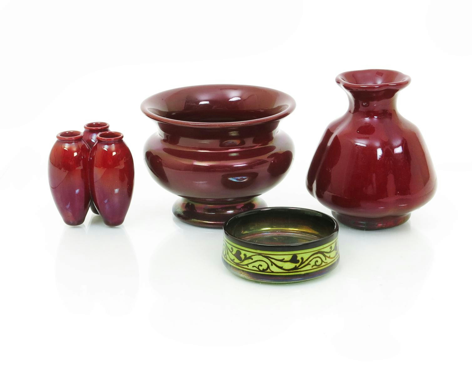 An unusual Pilkington's Lancastrian triple vase, covered in a ruby lustre glaze, a small circular box by Gladys Rogers, and two other ruby lustre items main vase unmarked, various other marks, 6.5cm. high (4)