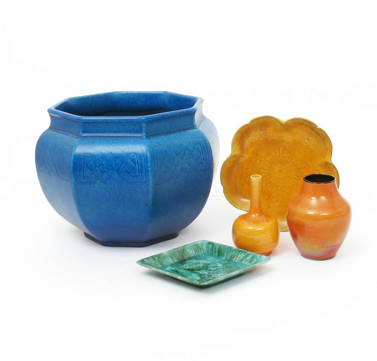 A large Pilkington's Royal Lancastrian jardiniere, shouldered octagonal form with cast Celtic knot panels, covered in a matt blue glaze, two experimental glazed vases and two dishes impressed marks, chip to corner of lozenge shaped dish, jardiniere 25cm. high (5)