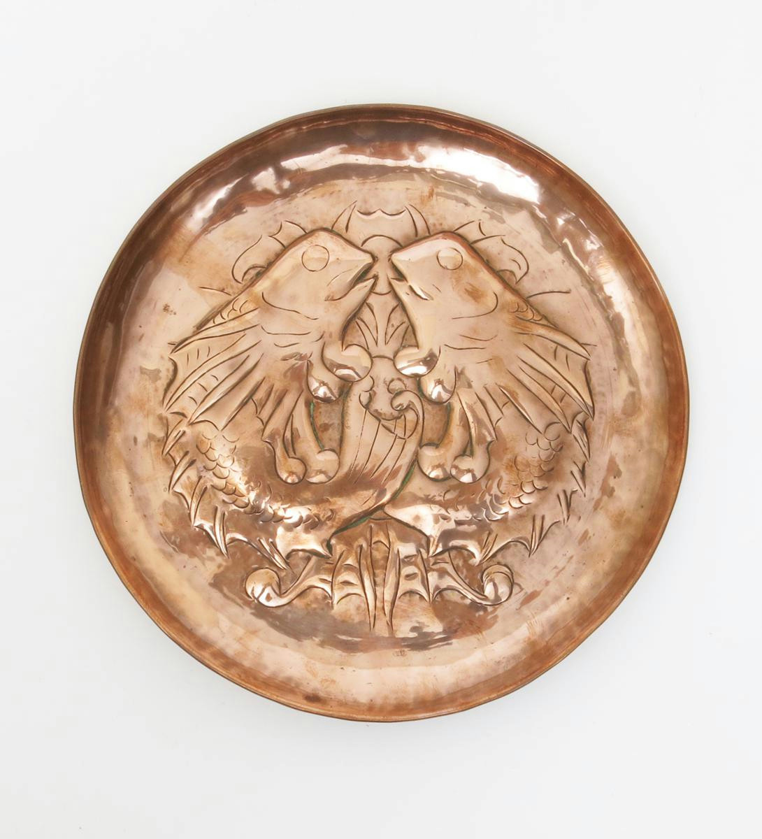 A small Newlyn Industrial Classes copper tray, repousse hammered with two gurnard fish before waterweed, inscribed to the reverse Designed by Newlyn Artists and worked by the fishers of St Ives 1906 20cm. diam.