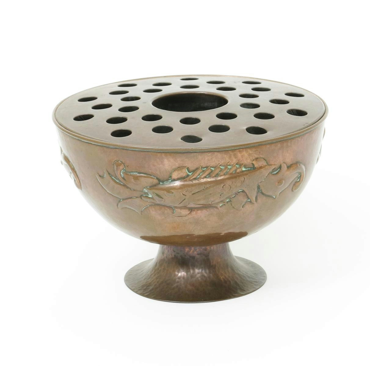 An unusual Newlyn Industrial Classes copper footed rose bowl and cover, hammered in relief with scaly fish before waterweed, the cover pierced for flower stems stamped Newlyn to base 18cm. diam.