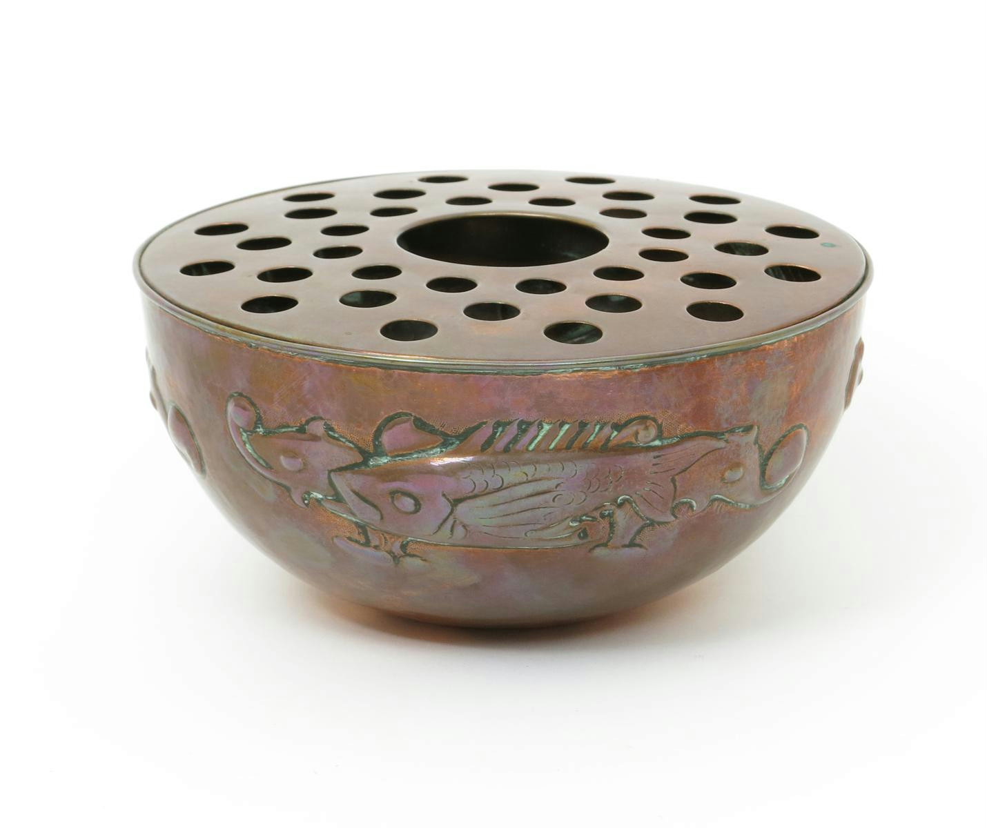 A Newlyn Industrial Classes copper rose bowl and cover, hammered in relief with scaly fish before waterweed, stamped Newlyn to rim 20cm. diam.