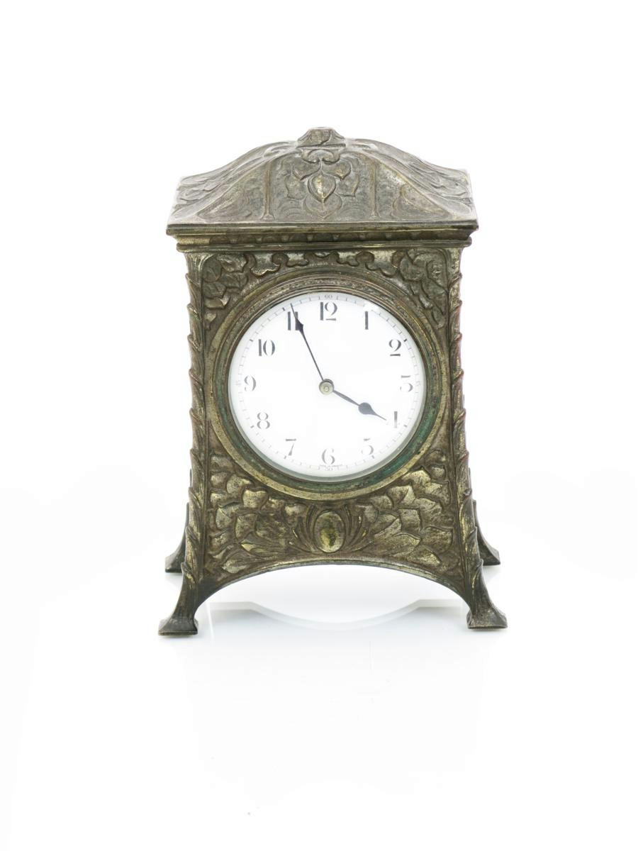 Ian Hamerton W.A.S Benson Arts and Crafts Luminary, Antique Collector's Club, plate 83 page 103 for a comparable example. This clock was available in two finishes copper bronze (£4/10/0) or antique silver (£4/15/0).