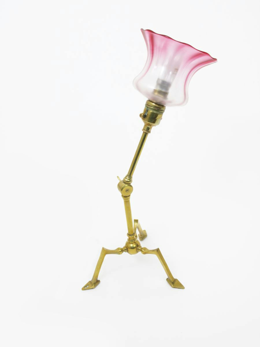 A W.A.S Benson brass table/wall lamp, on angular tripod foot, with articulated stem, frosted cranberry glass shade 42cm. high