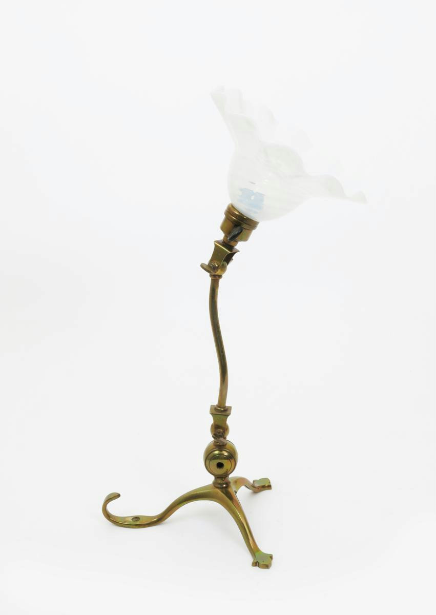 A W.A.S Benson brass table or wall light, on tripod foot, with articulated stem, with opaque glass shade stamped WAS Benson to foot 39cm. high
