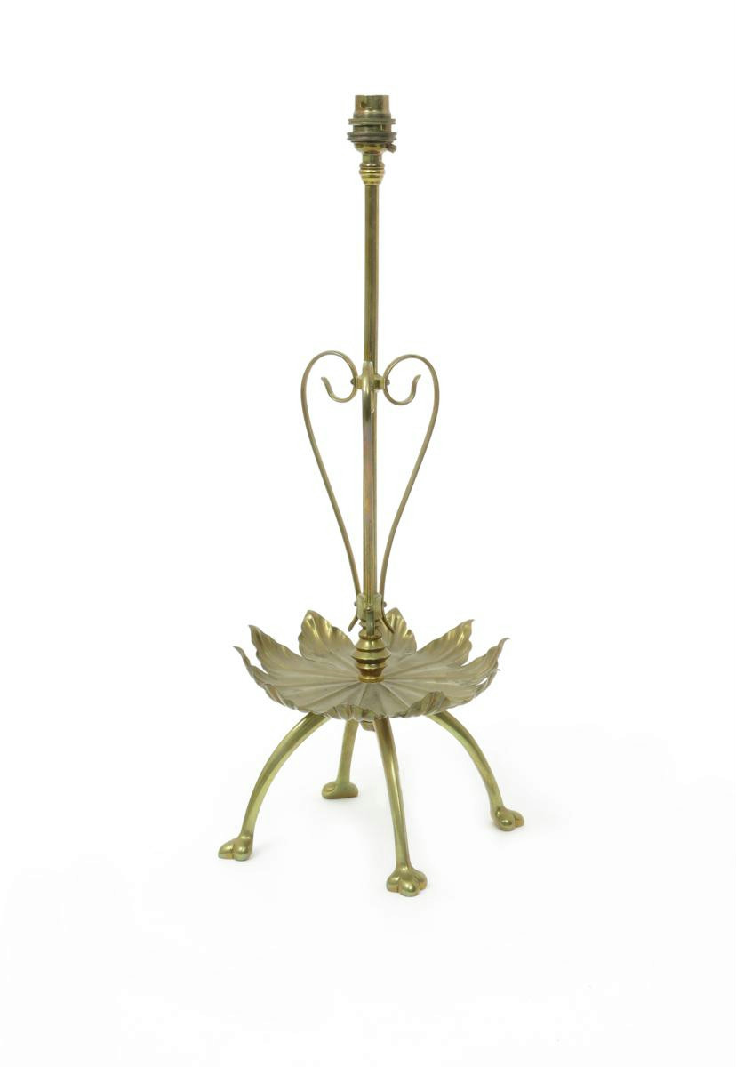 A W.A.S Benson copper and brass table lamp, model no.1195, the arched cruciform foot supporting foliate tray and central brass column, unsigned 52cm. high