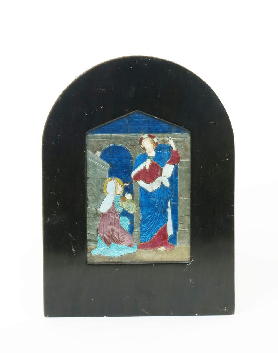 An enamel mosaic plaque Noli me Tangere, possibly by Henry Holiday, depicting Mary Magdalene kneeling at the feet of Jesus Christ, in an arched ebonised frame, 48 x 35.5cm.