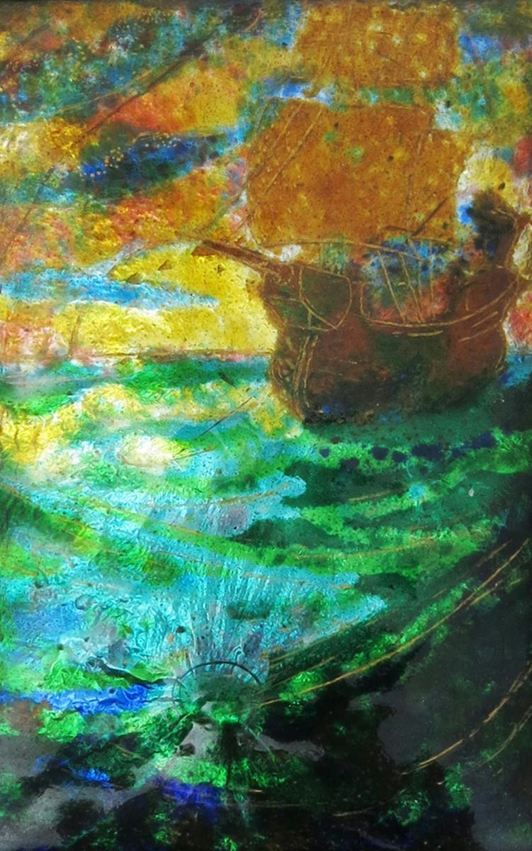 An enamel plaque retailed by H Rodman & Co, rectangular, enamelled with a galleon at full sail, in vivid colours, framed applied retailers label to reverse panel 14 x 8.5cm.