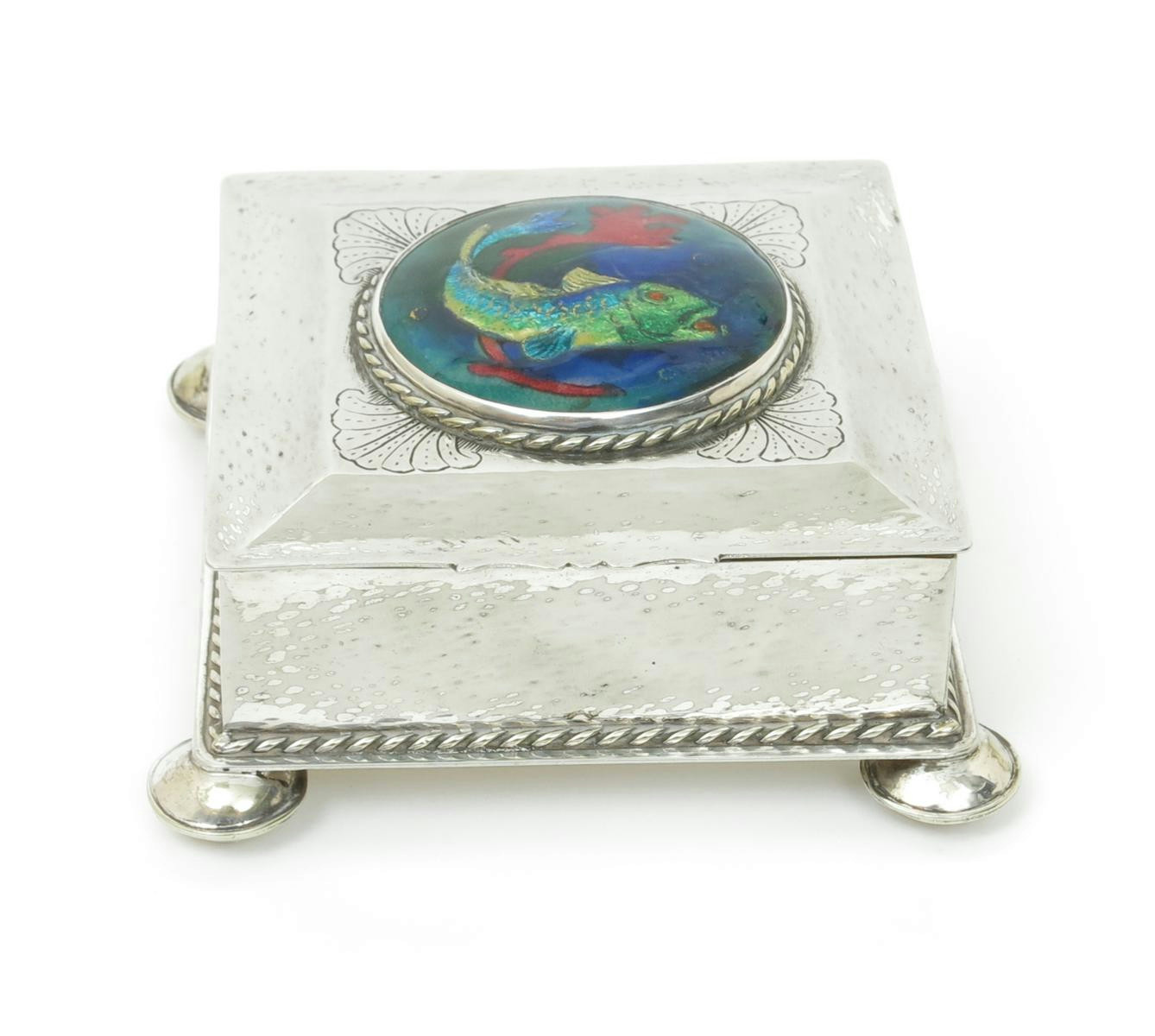 An electroplated box set with enamel roundel probably by The Guild of Handicrafts, square section on four bun feet, the hinged cover with chased foliate design and central enamel roundel of a fish before waterweed, in colours unsigned 11.5cm. wide