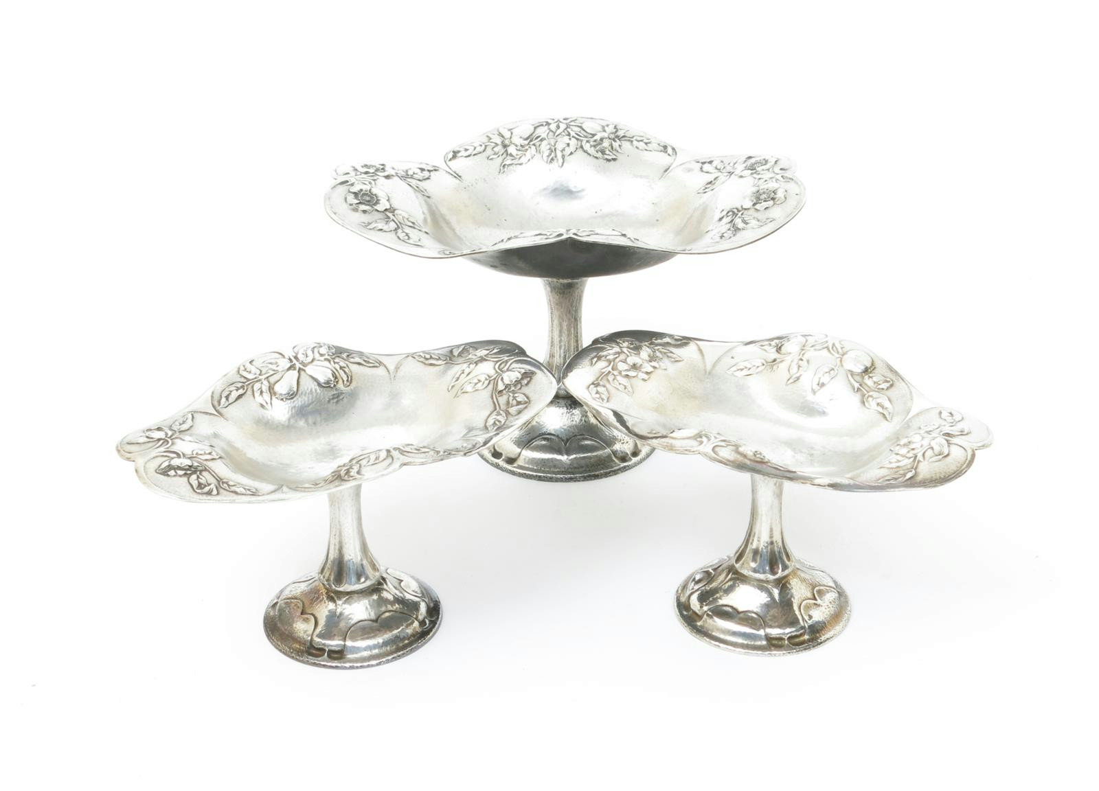 Three Holland Aldwinckle and Slater graduated silver tazza by Latino Movio, each bowl cast in low relief with various cornflower, wild rose, prunus blossom and fruit sprays, stamped marks, incised signature L Movio to rims, largest 26.5cm. wide