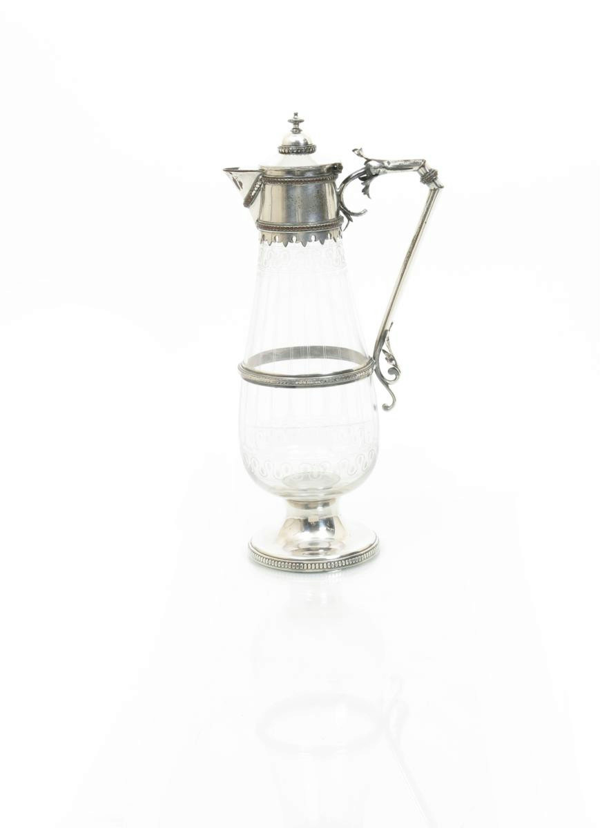 An Elkington & Co electroplated metal and glass claret jug, model no 12336, stamped marks to cover and mount 31.5cm. high