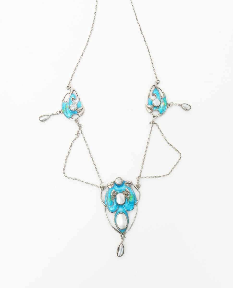 An enamelled silver necklace, pierced and cast in low relief, enamelled in shades of blue and green, with mother of pearl cabochon unsigned 5.5cm. long