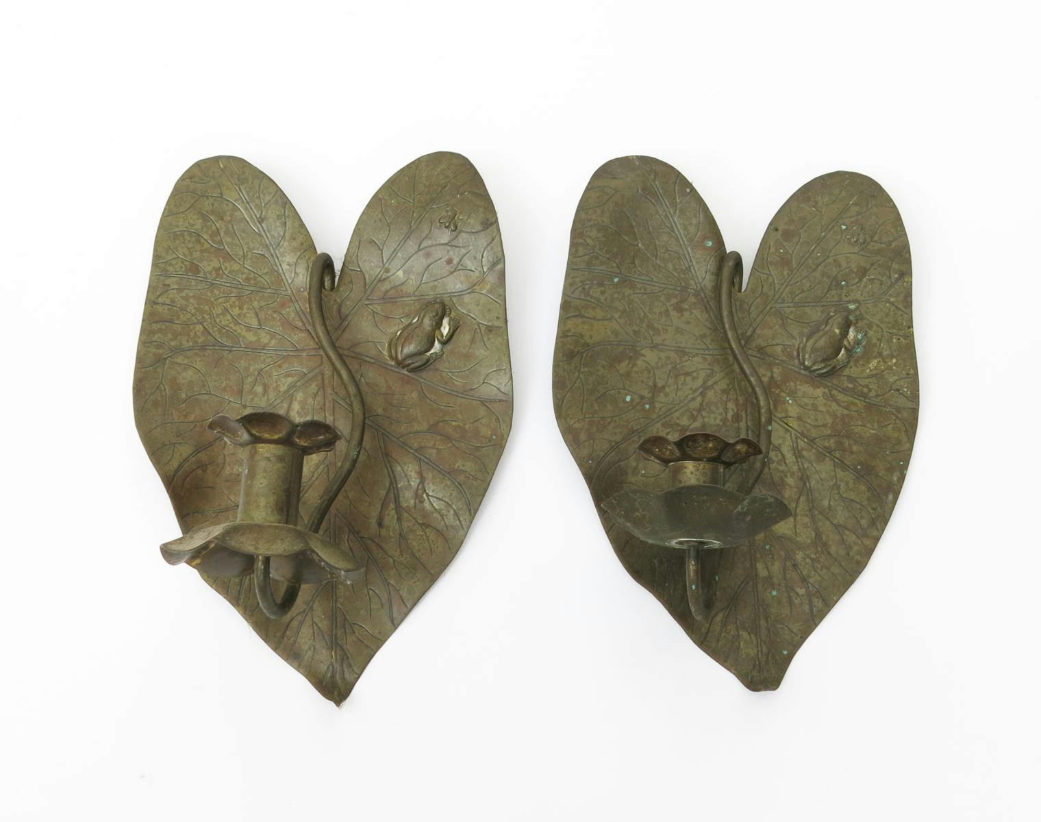 A pair of Japoniste brass wall sconce, possibly retailed by Liberty & Co, cast in low relied as a lily pad with small frog stalking a fly, the scrolling stem and floral sconce, stamped RD 17801 27cm. high