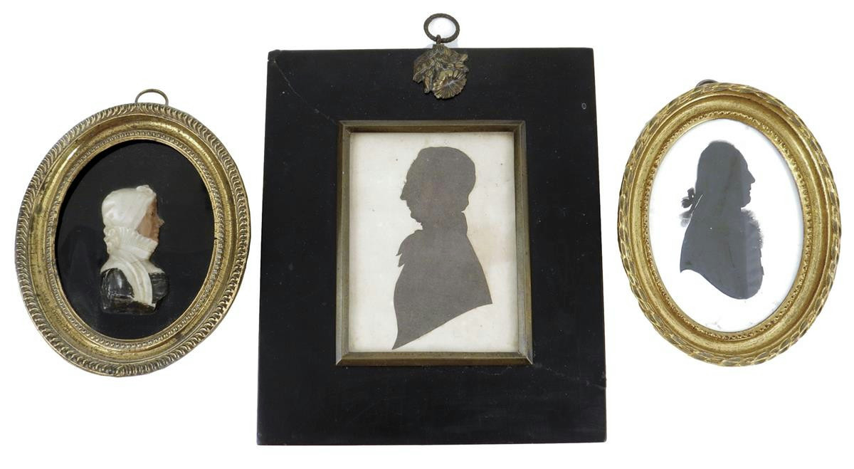 A George III silhouette of George Baillie Esq. by S Houghton, in a later frame, the back with remnants of the original paper label, 12.3 x 9.5cm, together with a silhouette portrait of a man in an ebonized frame and an 18th century wax bust of a lady. (3)
