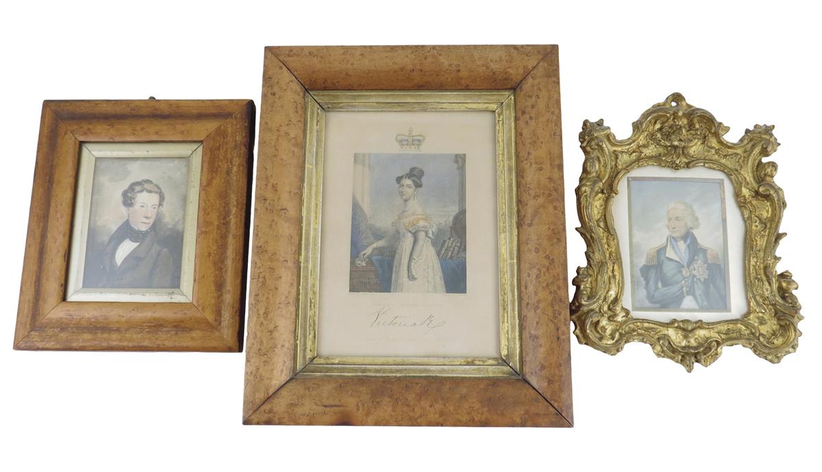 A coloured engraving of 'HER MOST GRACIOUS MAJESTY Victoria', after G. Hayter Esq. and engraved by J. Cochran, published by 'FISHER SON & CO PARIS 1837,' 19.7 x 13.8 in a glazed bird's eye maple frame, together with a watercolour portrait of a gentleman, in a bird's eye maple frame, and a Baxter print of Admiral Lord Nelson in a carved giltwood frame. (3)