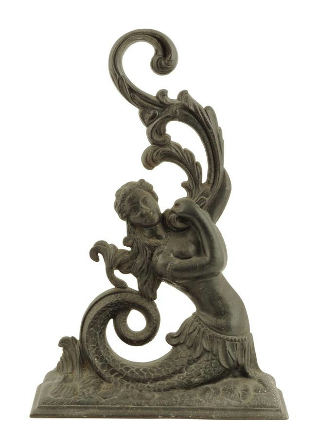 A Victorian cast iron doorstop, modelled with a mermaid supporting a leaf scroll handle, 40.9cm high, 27.8cm wide.