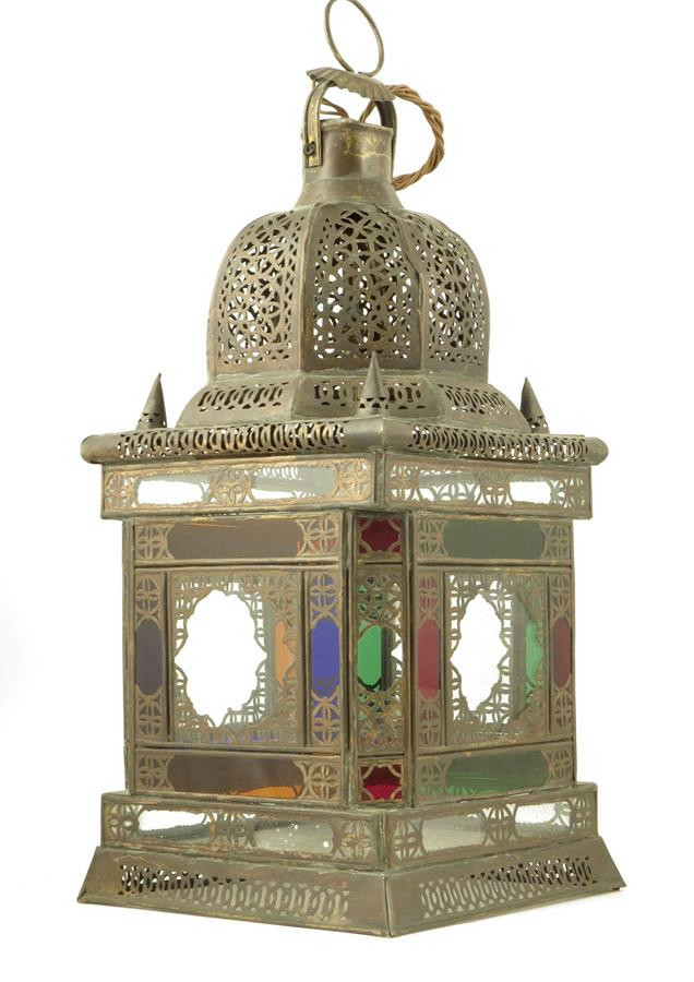 An Ottoman style brass mosque lantern, with pierced decoration and stained glass panels, 54cm high, 23.5cm wide.