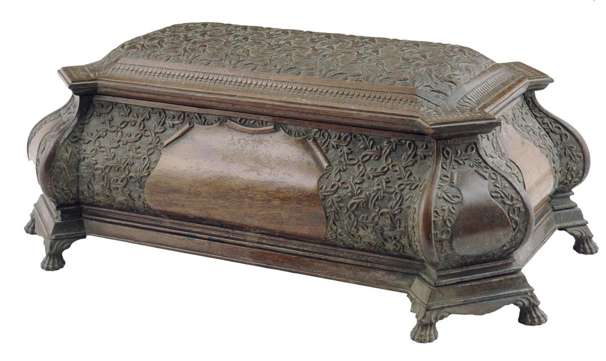 A 19th century Indian hardwood sarcophagus shape box, the hinged lid carved with a multitude of fish, above a vacant interior, the front with a cartouche and with relief panels of scrolling foliage, on paw feet, 16.9cm high, 43.7cm wide, 27.5cm deep.