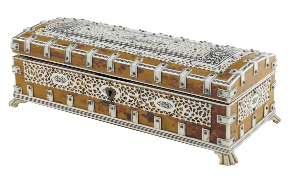 λAn Anglo-Indian tortoiseshell and ivory box, Vizagapatam, with pierced and lac decorated panels, one with a lion, the interior with a metal plaque inscribed 'TO SQUADRON LEADER T.E. PAVITT FROM THE PROFESSOR AND STUDENTS OF TELECOMMUNICATION ENGINEERING COLLEGE OF ENGINEERING GUINDY, MADRAS, WITH APPRECIATION AND GRATITUDE', the base inscribed with students' signatures, early 20th century, together with a typed letter from Professor Sreenivasan expressing his gratitude for the Squadron Leader Parvitt's help, 7.6cm high, 26.8cm wide, 12cm deep.