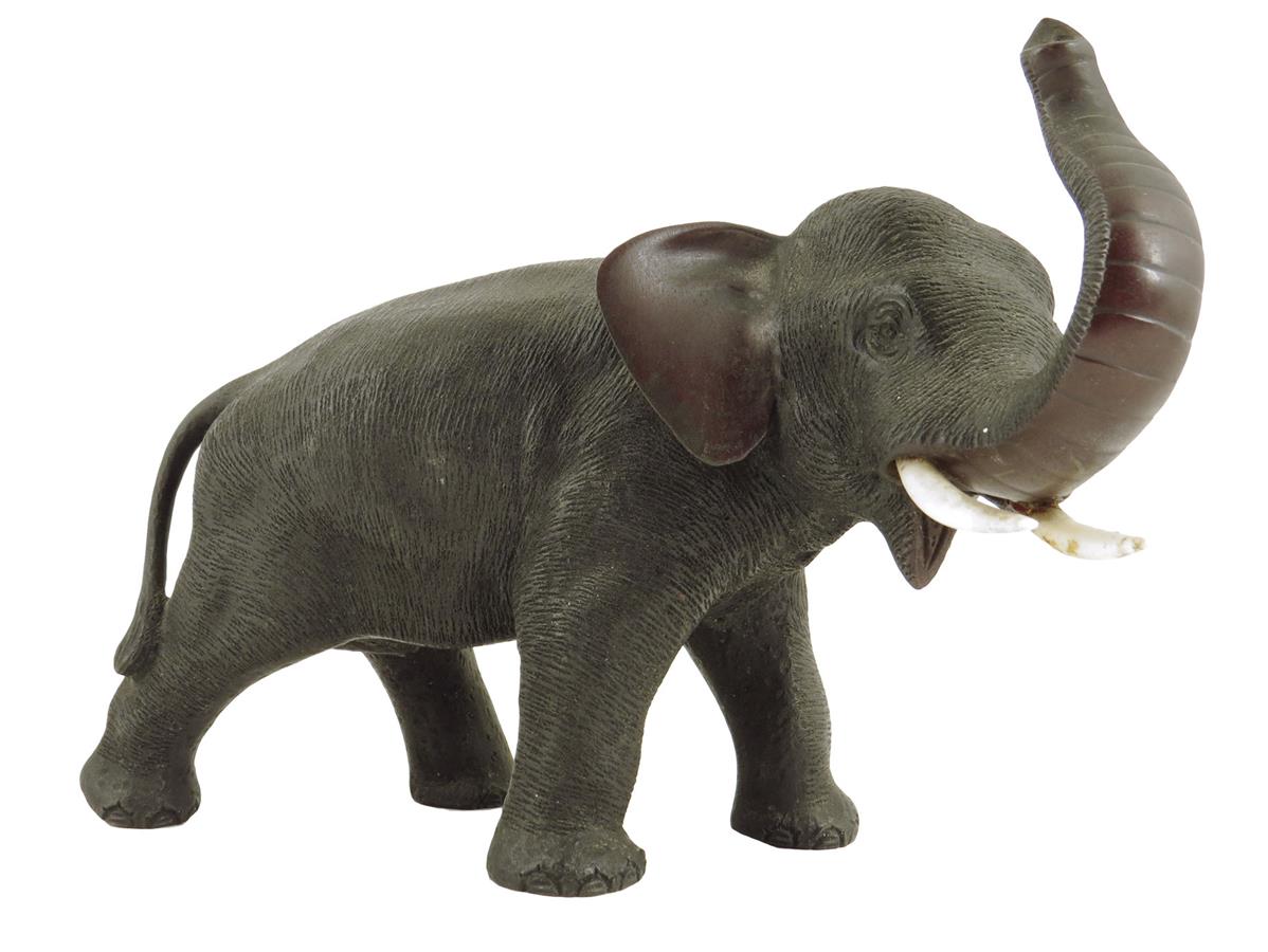 λA Japanese bronze model of an elephant, with ivory tusks, the underside with signature 'MEIJI 1868-1912', 12cm high, 20.7cm long.