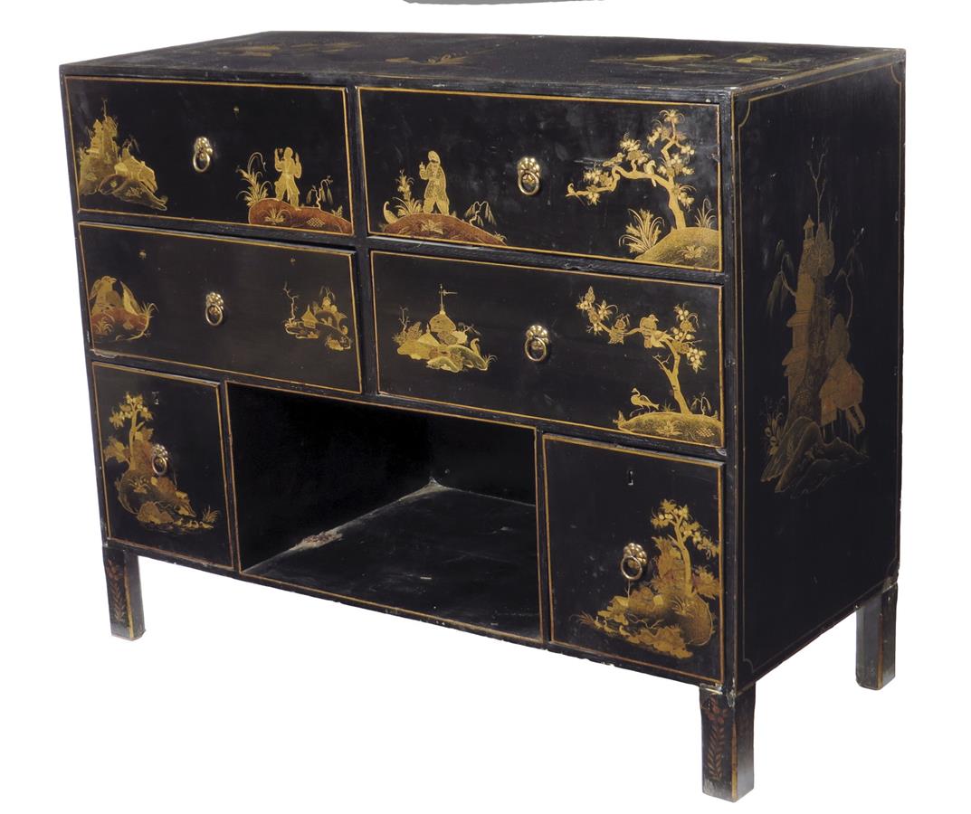 A Japanese black lacquer side cabinet, painted in gilt with figures in landscape scenes, with an arrangement of six drawers, 78.2cm high, 97.9cm wide, 40.5cm deep.
