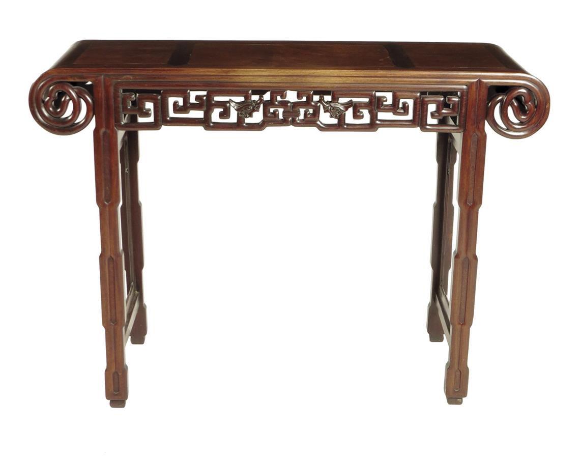 A late 19th century Chinese padouk altar table, with burr panels above a fret frieze carved with dragons' heads on open panel supports, 83.4cm high, 115.3cm wide, 39.3cm deep.