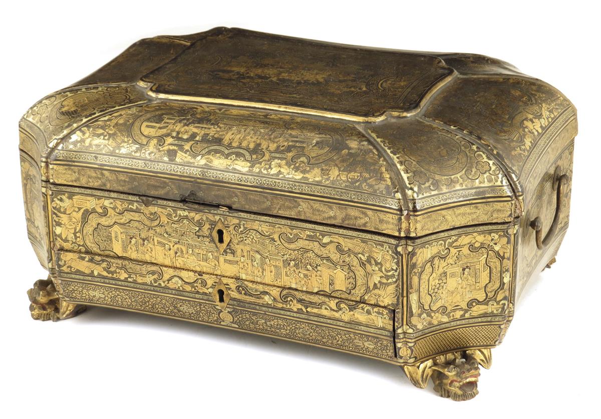 A 19th century Chinese export lacquer workbox, all over decorated in gilt with panels of figures in various pursuits, the interior with a divided lift-out tray with a pair of lidded compartments, with a base drawer fitted with a hinged slope with pen and ink compartments, on carved giltwood bat feet, 16.4cm high, 36.5cm wide.