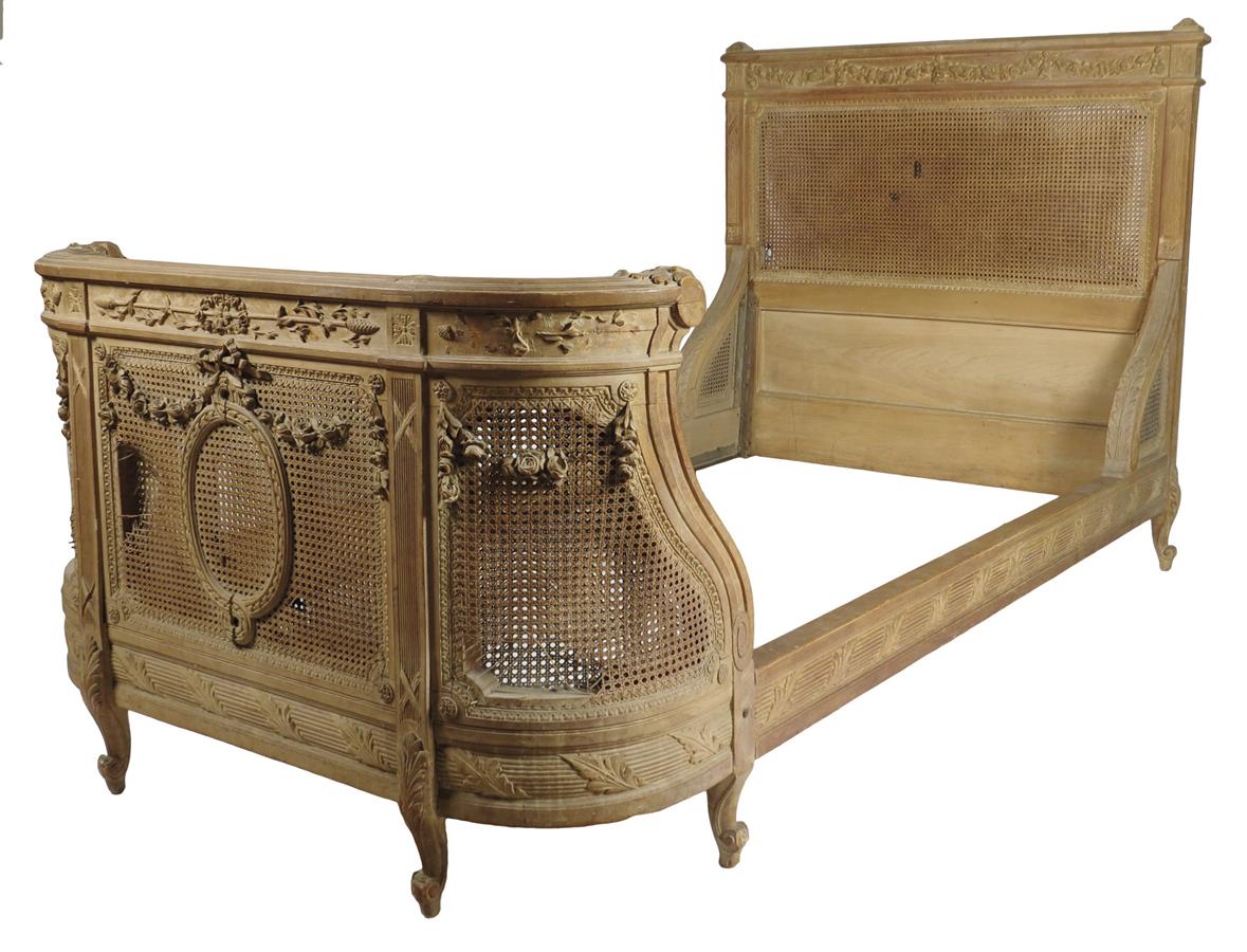 A Louis XI style beechwood single bed, with double caned head and foot boards, with applied carved swags of flowers, the front with a ribbon tied cartouche, late 19th century, 122.8cm high, 220cm long, 120.2cm deep.