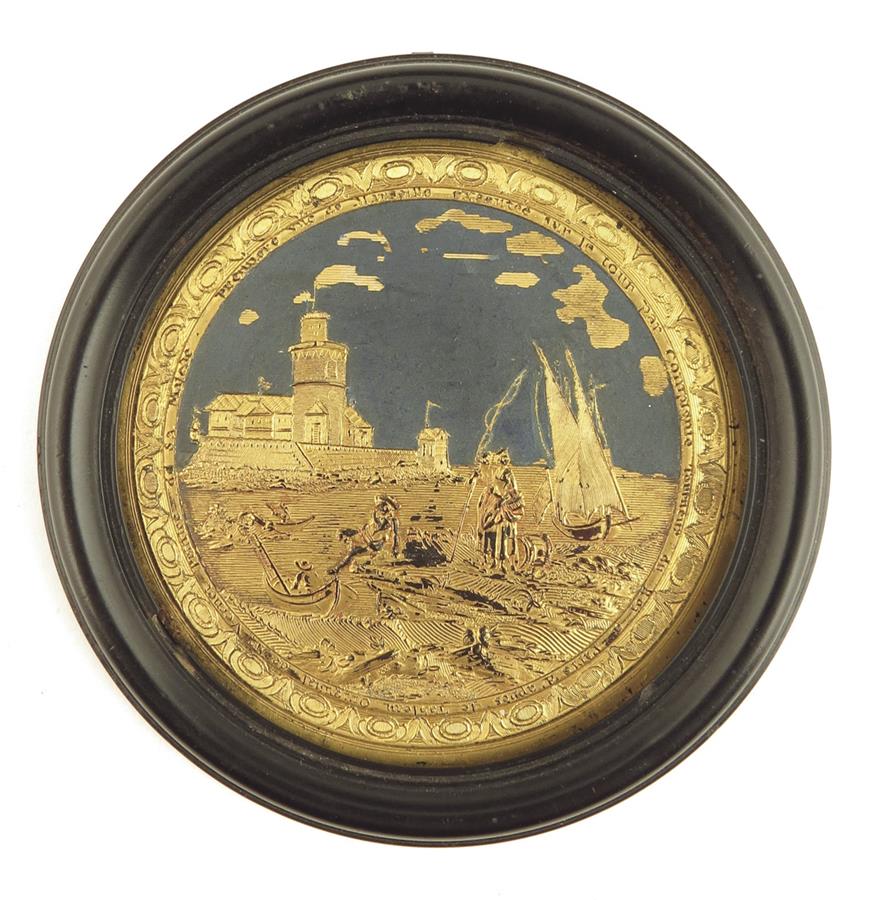 A rare Louis XVI gilt impressed tortoiseshell and polychrome decorated medallion by Compigné, depicting a view of Marseilles harbour, inscribed 'Premiere Vue de Marseille executée sur le tour par Compignie Tourneur du Roi a Paris d'apres le Tableau Original de M. Vernet de sa Majeste', 7.8cm diameter, in an ebonised moulded frame.