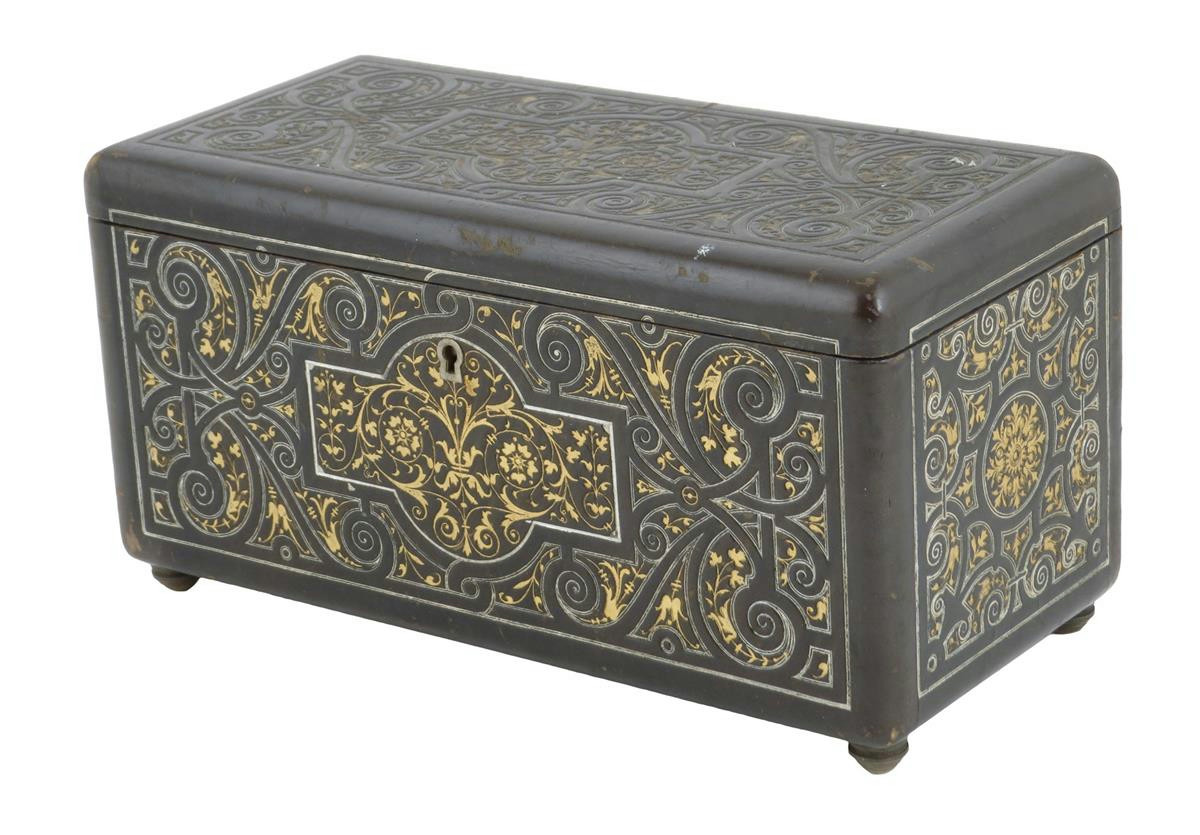 A late 19th century French leather box, with a gilt and silver tooled decoration of scrolling leaves, with a silk lined interior, 12.8cm high, 25.3cm wide, 12cm deep.
