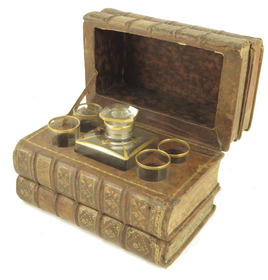 An early 20th century French leather bound book decanter box