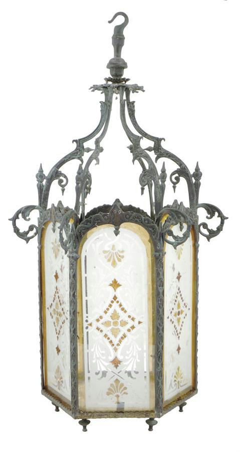 A Victorian cast brass hexagonal hall lantern, with etched stained glass panels, with a leaf and scroll decorated frame, 70.5cm high, 38.3cm wide.