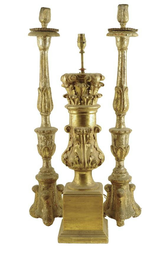 A pair of 18th century Italian silvered wood altar candlesticks, each with a fluted lappet carved stem and triform base, 82.2cm high, together with a 19th century Italian giltwood lamp base, 71.7cm high. (3)