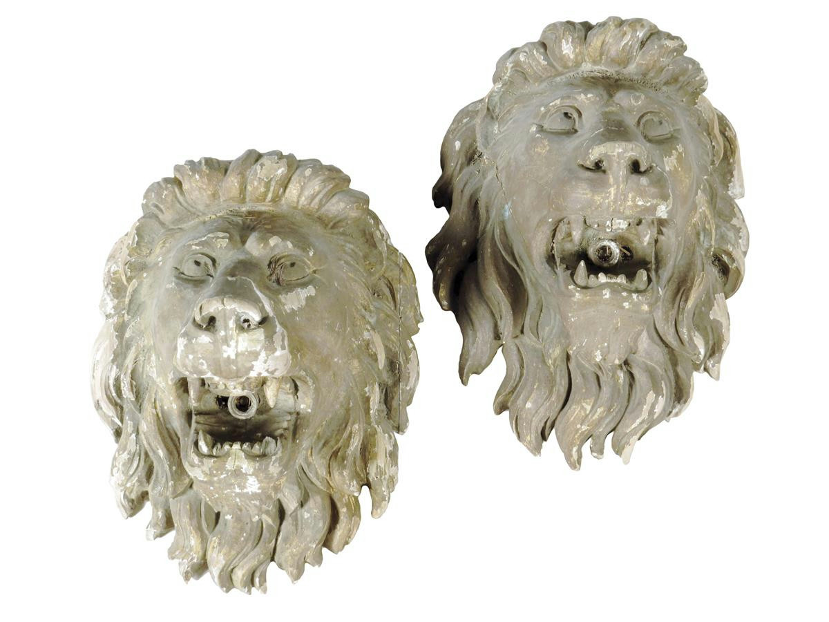 A pair of painted carved pine lions mask wall lights