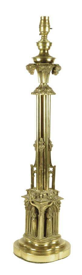A William IV gilt brass Gothic style table lamp, with a cluster column stem, the base with a female robed figure within an arch door, 67.3cm high, 15.5cm wide.