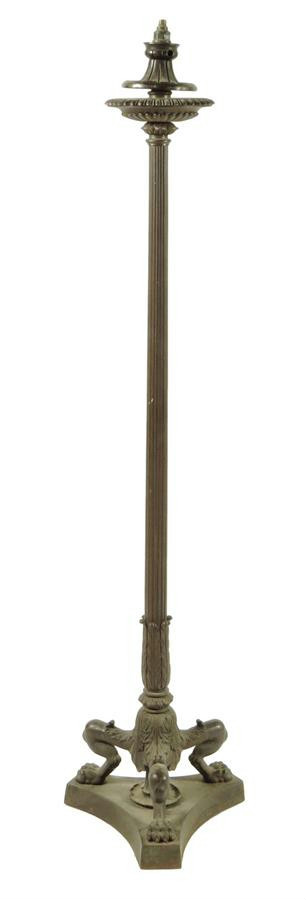 A bronze and cast iron standard lamp in Regency style, with a reeded stem on tripod supports, late 19th / early 20th century, 136.8cm high, 31.4cm wide.