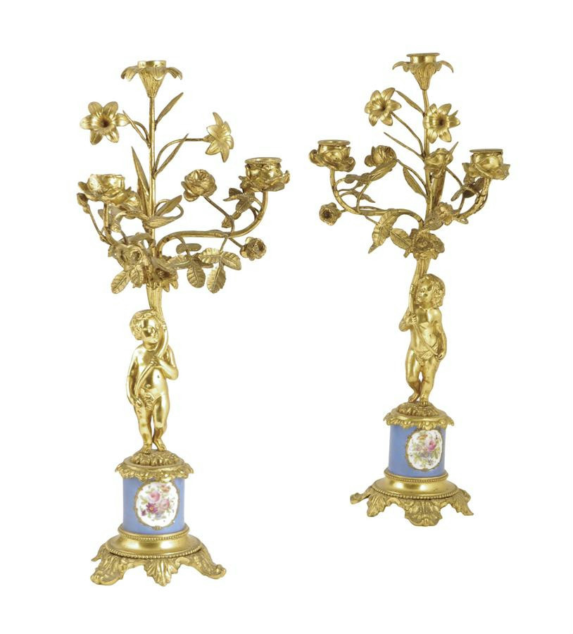 A pair of late 19th century French ormolu and porcelain four light candelabra
