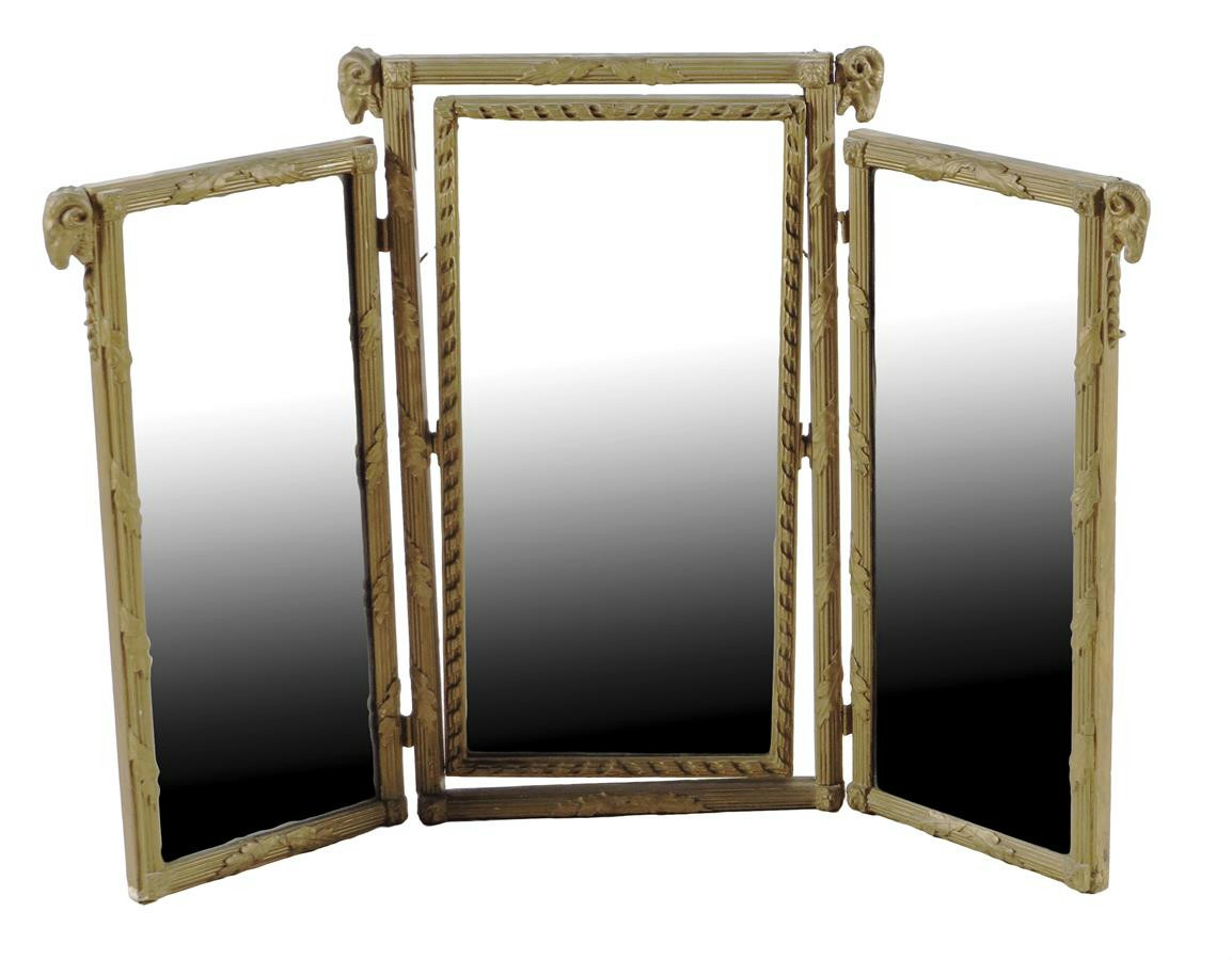 A gilt triptych dressing table mirror, with ram's head finials and a leaf wrapped frame, with a tilting central plate, 75 x 114.2cm.