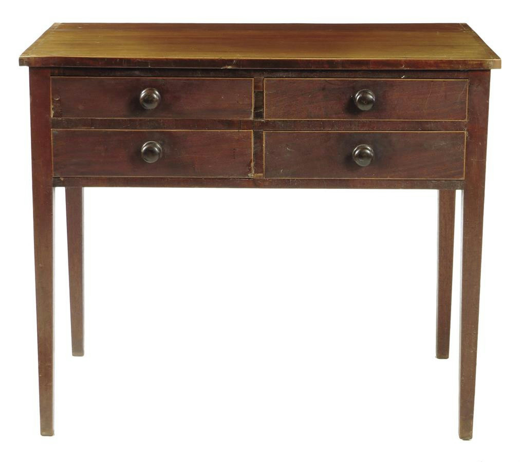 A George IV mahogany side table, inlaid with boxwood stringing, the crossbanded top above four short drawers, 72.6cm high, 84.5cm wide, 47.2cm deep.