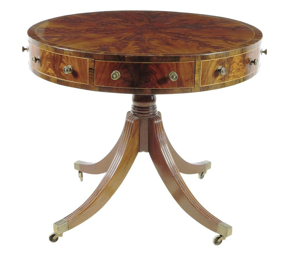 λA mahogany drum table, the rosewood crossbanded fixed top with flame segmented veneers, above four frieze drawers interspersed with false fronts, on reeded supports, 78cm high, 91cm diameter.