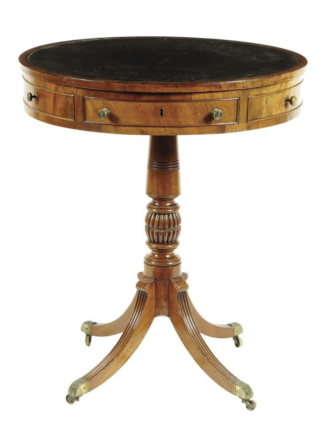 A George IV mahogany drum table, the circular top inset with tooled black leather, above two cedar lined frieze drawers, and two false fronts, the turned stem on reeded supports terminating in foliate brass sabots and castors, 76.3cm high, 65cm diameter.
