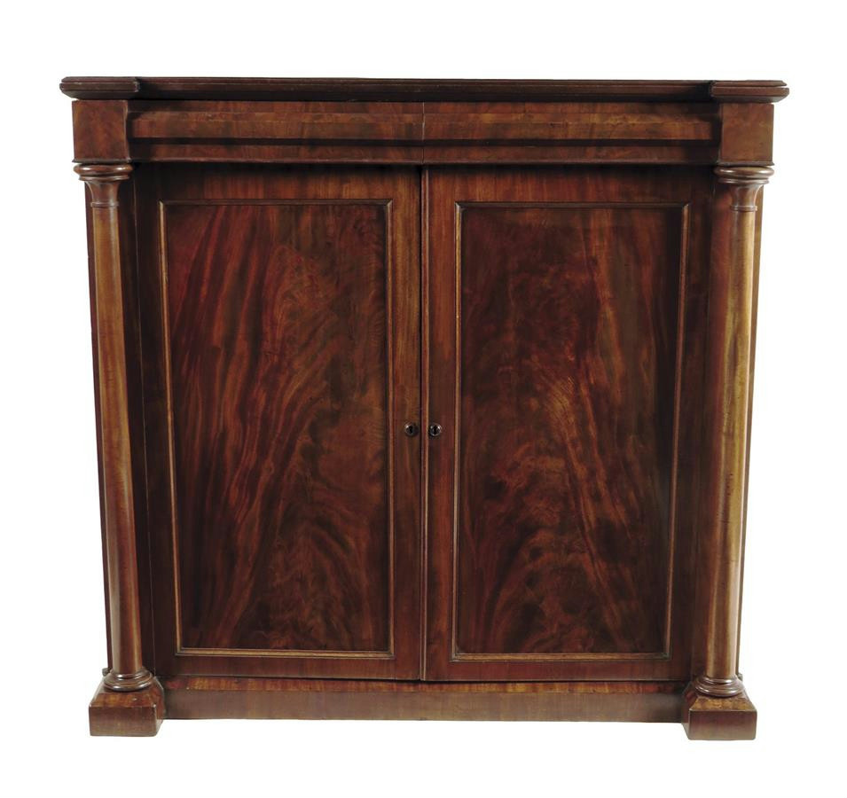 An early Victorian mahogany inverted breakfront collector's cabinet, with a pair of frieze drawers, above a pair of turned columns flanking panelled doors enclosing twenty short drawers, 113.2cm high, 116.8cm wide, 54.3cm deep.