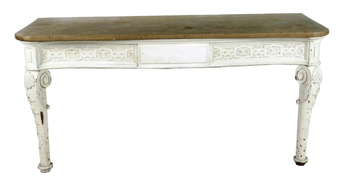 A 19th century Irish painted and carved oak console table, the later pine top above a foliate and strapwork frieze, on shell capped husk and scroll legs, 85cm high, 179.8cm wide, 67.8cm deep.