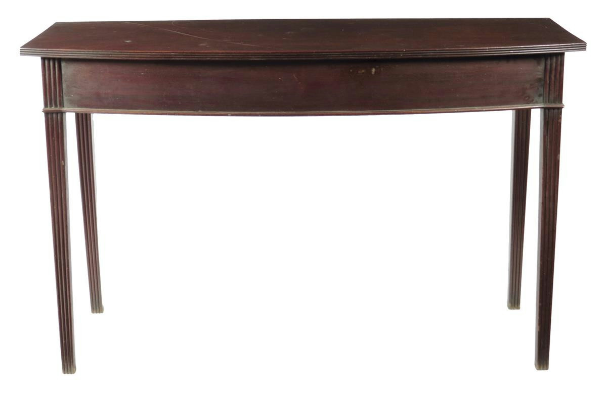 A Regency mahogany bowfront serving table, with a reeded edge top on ribbed tapering legs, 83.1cm high, 132.4cm wide, 49.6cm deep.