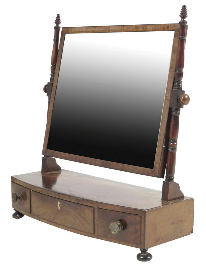 A Regency mahogany toilet mirror, with ring turned supports on a bowfront base fitted with three drawers, 69.9cm high, 63.9cm wide, 25.2cm deep.