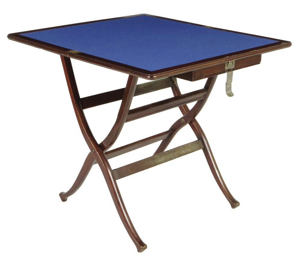 A mahogany coaching games table, with a drawer having divisions, a white metal handle and a baize lined surface, replaced brasswork, early 20th century, 73.7cm high, 86 x 77.6cm (open).