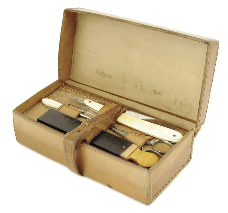 A brown leather cased Campaign toilet set, fitted with a hone, steel scissors, a button hook, a razor, a shaving brush in a bone case, and two other brushes and with a metal soap container, the lid with initials 'J.H.B.', 21cm wide.